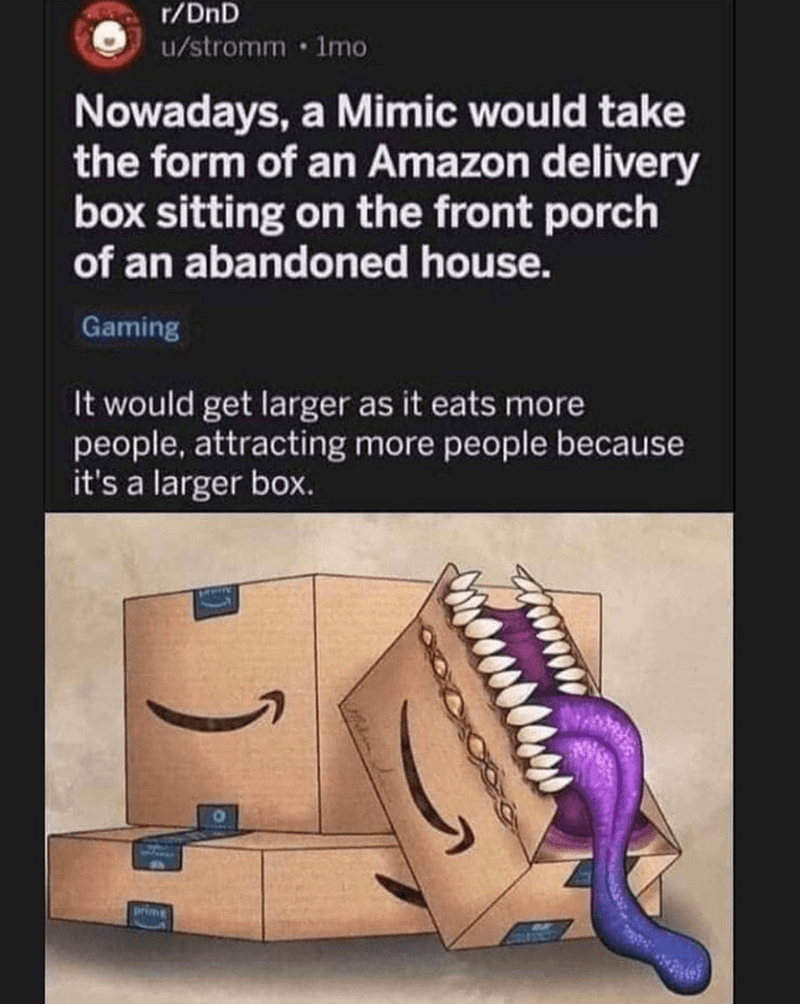 Picture this: A Mimic takes the form of an Amazon box, and it keeps getting bigger by ‘eating’ people!
