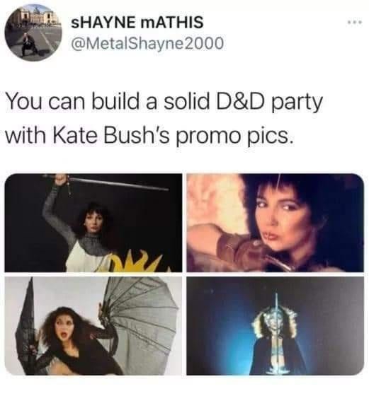 “You can build a solid D&D party with Kate Bush’s promo pics!”