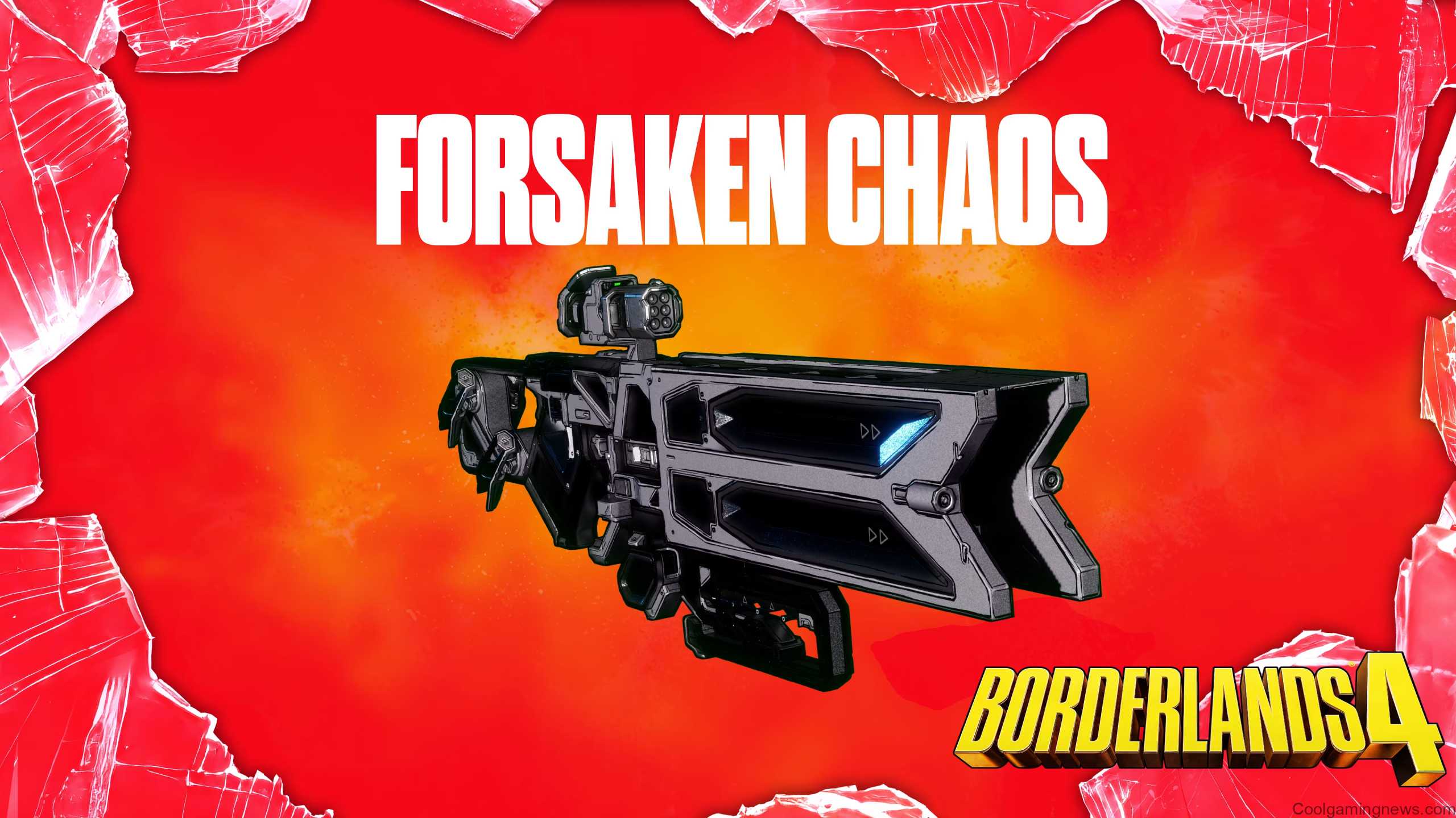 Borderlands 4 Twitch Drops: The Forsaken Chaos shotgun against a red background, framed by broken glass.